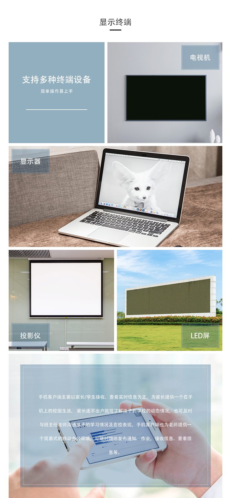 支持電視機(jī)、顯示器、投影儀、LED屏、手機(jī)端等多種顯示終端,簡(jiǎn)單操作易上手。手機(jī)客戶端主要以家長/學(xué)生接收、查看實(shí)時(shí)信息為主,家長逐不出戶就可了解孩子到學(xué)校的動(dòng)態(tài)情況,也可及時(shí)與班主任老師溝通孩子的學(xué)習(xí)情況及在校表現(xiàn)。手機(jī)客戶端也為老師提供一個(gè)簡(jiǎn)易式的移動(dòng)辦公環(huán)境,可隨時(shí)隨地發(fā)布通知、作業(yè),接收信息、查看信息等。